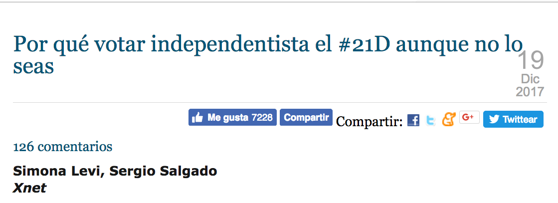 Voilà pourquoi un vote en faveur de Catalunya en Comú n'aide pas à sortir de la boucle narrative de "procés oui"ou "procés non". Cela ne sert qu'à permettre au bloc du 155 de s'affirmer gagnant et d'accroître son arrogance. Ceux qui se sentent proche de Catalunya en Comú ne doivent se faire du souci : par pure mathématique électorale, il est plus que probable que Catalunya en Comú détiendra la clé du futur gouvernement, et cela indépendamment qu'il ait beaucoup ou peu de voix.