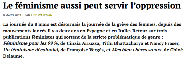 On peut avoir des désaccords avec certaines convictions défendues par les auteures de ces deux essais : si lier capitalisme et oppression des femmes paraît fondamental, coupler strictement questions de genre et questions de classe conduit à négliger le fait que cette oppression n'est pas seulement le fait du capitalisme – ce que les auteures duFéminisme pour les 99 % rappellent du reste, mais dont elles ne traitent guère, par crainte sans doute de retomber dans des arguments culturalistes hautement problématiques. On peut aussi être agacé par la lecture trop schématique que Françoise Vergès donne d'un certain féminisme, lorsqu'elle se penche sur l'histoire du MLF : dans le but délibéré de sortir d'un statut de marginalité politique, il se serait agi de remplacer (mais qui y a-t-il donc derrière ce « il » impersonnel ?) l'adversaire du féminisme désigné dans les années militantes, c'est-à-dire « le patriarcat blanc, l’État et le capital », par l’islam.