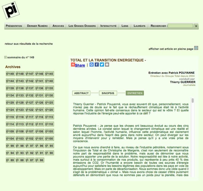 Pour le journal de Total, Thierry Guerrier interviewe régulièrement les dirigeants du groupe. Mais ces échanges peuvent se retrouver ailleurs, comme cet hiver dans la revue Politique internationale (voir un article de Rue89 sur les coulisses de cette revue). On y trouve une interview de Patrick Pouyanné, PDG de Total, par celui qu’il paie indirectement tous les mois, Thierry Guerrier, présenté dans la revue comme « journaliste ».