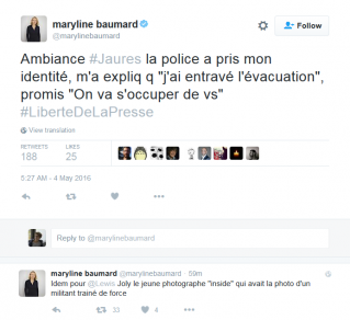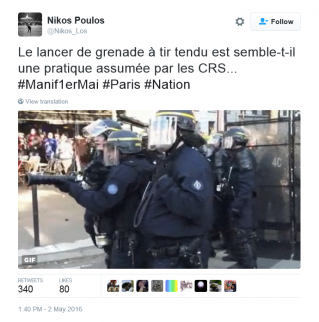 Elle complétait : "Idem pour Lewis Joly, le jeune photographe "inside" qui avait [pris] la photo d'un militant trainé de force". Son témoignage fait écho à ceux recueillis ces derniers jours auprès de journalistes indépendants : coups de matraque malgré les mains levées et l'appareil photo en évidence, gaz lacrymogène à bout portant, photographe blessé par une grenade de désencerclement.