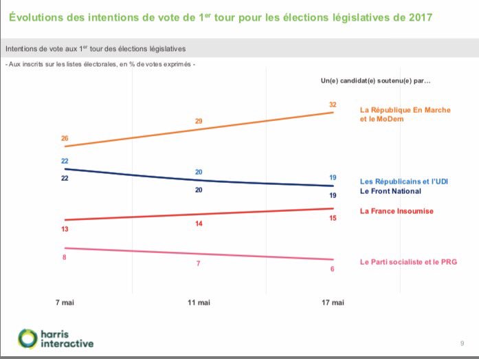 Le matraquage mediatique produit malheureusement ses effets. Espérons que les choses s'inversent d'ici au 11 juin. Malgré le matraquage, seuls 23% des sondés veulent que la créature du Medef dispose d'une majorité absolue... peut être un signe de l'extrême fragilité de ces intentions de vote dopées par la propagande.... On notera également la progression de la France insoumise et le déclin du PS, de LR, et du FN....