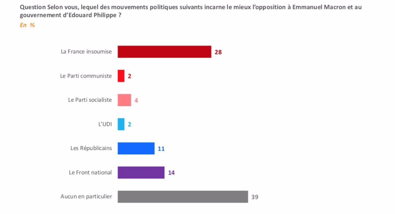 Le nouveau sondage "L'opinion en direct" réalisé par l'institut Elabe pour BFMTV et publié ce mercredi a cherché savoir quel mouvement politique incarnait le mieux l'opposition à Emmanuel Macron et au gouvernement d'Edouard Philippe. 39% des Français n'en ont désigné aucun en particulier. Mais la formation politique la plus fréquemment citée s'avère être la "France insoumise", qui a recueilli 28% des suffrages. Le Front national n'est choisi que par 14% des sondés. "Les Républicains", quant à eux, totalisent 11%. Le Parti socialiste ne rassemble que 4% des réponses, devant le Parti communiste et l'UDI qui accumulent tous deux 2%.