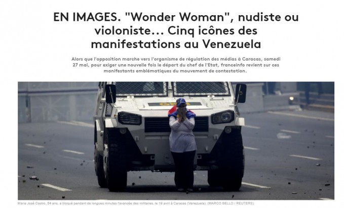 En bonne place, au côté du portrait du violoniste, cette image d’une mère seule, dressée devant un véhicule blindé de l’armée pour bloquer l’avancée des militaires. Une image qui rappelle celle de ce manifestant chinois photographié en 1989, défiant une colonne de chars sur la place Tiananmen. Autant d’images qui dessinent le portrait d’une opposition citoyenne désarmée mais déterminée face aux violences de l’armée. Parmi les "héros" des manifestations, une jeune manifestante (visible ci-dessous) baptisée par l’opposition "Wonder Woman" , mais aussi un journaliste faisant face, nu, aux forces de l’ordre avec pour unique arme une bible à la main.