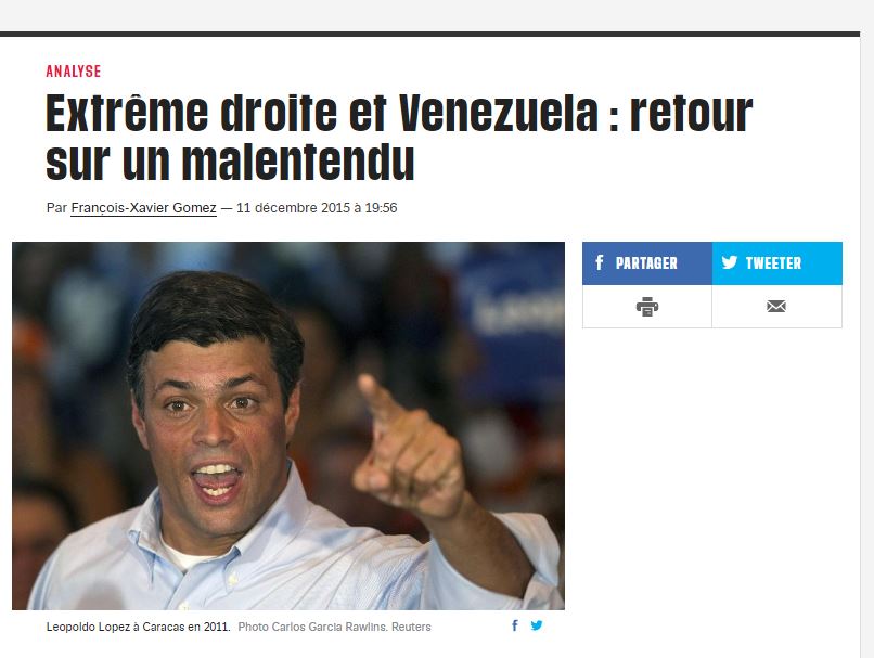 > Cliquez sur l'image pour un gros plan <Voilà qui n’est pas nouveau, puisque dès 2013, après la mort d’Hugo Chavez, la MUD a refusé de reconnaître la légitimité de l’élection de son dauphin Maduro. "A partir de ce moment, il y a eu un débat stratégique au sein de l’opposition quant à la tactique à suivre", rappelle Ventura qui constate que c’est la branche dure de l’opposition, celle du parti Voluntad Popular et de son leader Leopoldo Lopez, qui a toujours défendu l’insurrection, qui prédomine désormais. En 2002, Lopez, alors maire de Caracas, participait au coup d’État visant à destituer Hugo Chavez. "Un réactionnaire radical dont les modérés de la MUD essaient de se démarquer depuis longtemps", analysait en 2015 dans Libé le président de l’Observatoire politique de l’Amérique latine et des Caraïbes, Olivier Dabène. "Un néolibéral en économie et un catholique conservateur en matière sociétale", estimait quant à lui l’enseignant à l’Institut des hautes études de l’Amérique latin, l’historien Olivier Compagnon.
