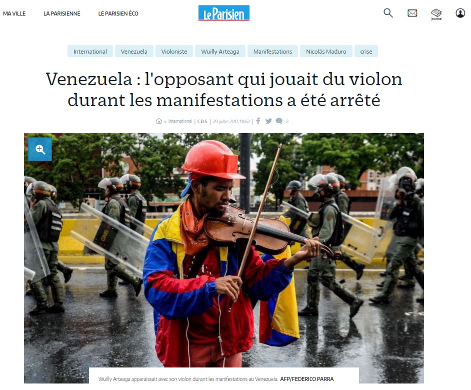 De LCI au Parisien en passant par Le Monde et Le Figaro, tous ont repris les images et l’histoire d’Arteaga, ce manifestant pacifique qui joue du violon au milieu des bombes lacrymogènes lancées par les forces de l’ordre. "A chaque mouvement populaire son symbole et ses héros. Celui du Venezuela se nomme Wuilly Arteaga", écrivait le 24 juillet Paris Match qui lui consacrait un portrait qui voyait en lui "le symbole de la jeunesse vénézuélienne hostile au coup de force anti-démocratique" de Maduro. "il est maigre et semble bien fragile face aux forces de l’ordre vénézuéliennes - mais Wuilly Arteaga promet de rester fort pour résister au président Maduro", relatait Ouest-France le 23 juillet dans un article titré "Notes de musique contre balles de caoutchouc".