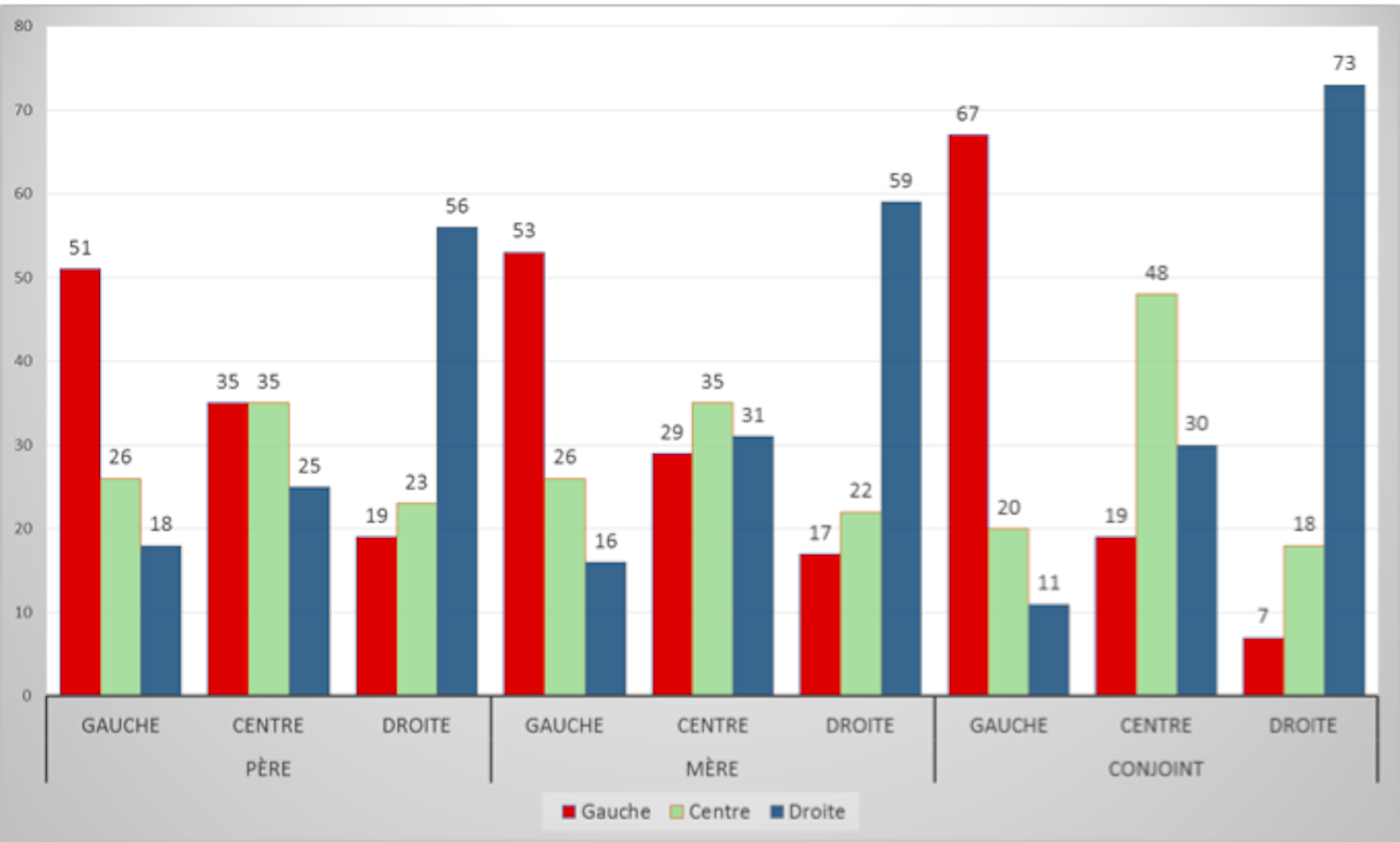 Graphique 3 : orientation politique du répondant (en %) en fonction de celle de son père, de sa mère et de son conjoint.