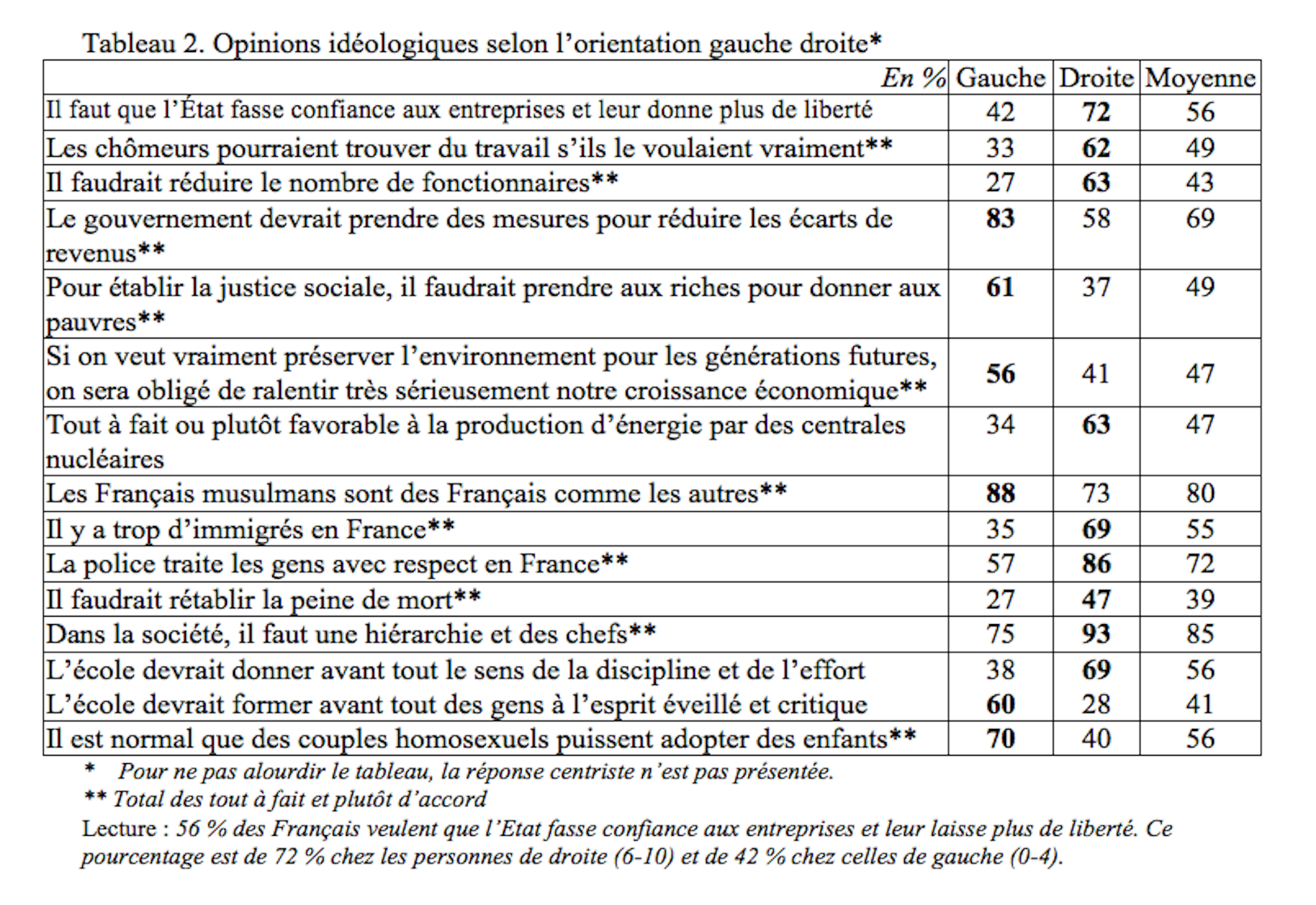 Les identités de gauche et de droite ne se reflètent pas seulement à travers le vote. Elles se manifestent aussi – plus ou moins fortement – dans les réponses à à peu près toutes les questions d’opinion (tableau 2).
