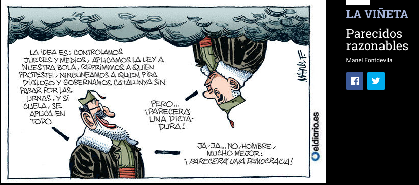 - L'idée c'est : nous contrôlons les juges et les médias, nous appliquons la loi comme ça nous chante, nous réprimons ceux/celles qui protestent, nous négligeons d'écouter qui demande du dialogue et nous gouvernons la Catalogne sans en passer par les urnes. Et si ça prend, on applique à toutes choses.