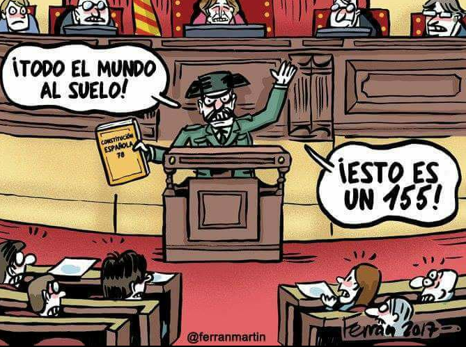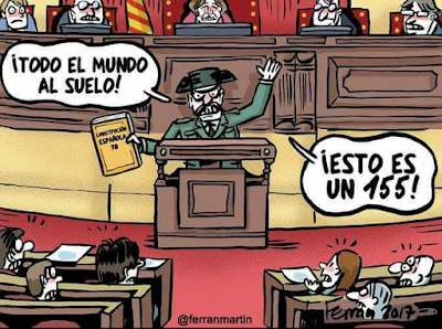 Il est à noter que la mise au point des détails de cette mesure d'exception est l'oeuvre d'un groupe de travail resserré associant au plus près à l'équipe du Parti Populaire desresponsables du PSOE, membres du premier cercle de son secrétaire général. C'est dire le degré de connivence, plus justement, de complicité, qu'il existe, sur une question aussi significative de l'orientation antidémocratique et, pardon pour la redondance, antipopulaire de l'Etat espagnol, entre la "gauche" et la droite. Le masque tombe définitivement sur la réalité du nouveau PSOE qu'était censé incarner Pedro Sánchez : sous son égide de "novateur" ayant opéré, nous disait-on, un tournant à gauche des socialistes, on voit se reconstituer le bipartisme honni que les Indigné-es avaient si fortement et durablement déstabilisé. Les deux forces politiques historiques du système de la Transition, aussi désigné régime de 78, (année du vote de l'actuelle constitution),rescellent le pacte de convergence initial contre le mouvement populaire à l'oeuvre en Catalogne et, par là-même, signifient, avec l'impact de l'unisson retrouvé, à tous les peuples d'Espagne ce qu'il en coûtera désormais de tenter de sortir du cadre posé "constitutionnellement" en 1978, sous le chantage des Forces armées franquistes, pour que se recycle politiquement le pouvoir capitaliste. La crise de 2008 ayant rompu 30 ans de fascination magnétique et de fatalisme apolitique envers le consensus autour de la Constitution, celle-ci mobilise les ressources répressives qu'elle maintenait en réserve dans ses soutes pour faire face à une montée des contestations. La preuve la pluséclairante par la Catalogne, mais on n'oubliera pas les prémices constituées, entre autres, par la tristement célèbre "loi bâillon" (2015, lire ici).