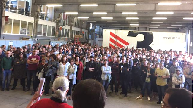 - réunis en assemblée générale, les travailleurs/-ses de la chaîne publique TV3, qui sera mise sous contrôle "155" de l'Etat espagnol, ont déclaré qu'ils/elles ne reconnaîtront pas l'autorité des responsables que désignera Madrid. Seul le Parlament est habilité, selon eux/elles, à prendre les décisions de nomination ad hoc pour la chaîne et les mesures annoncées par Rajoy sont une atteinte au droit à l'information des citoyens.