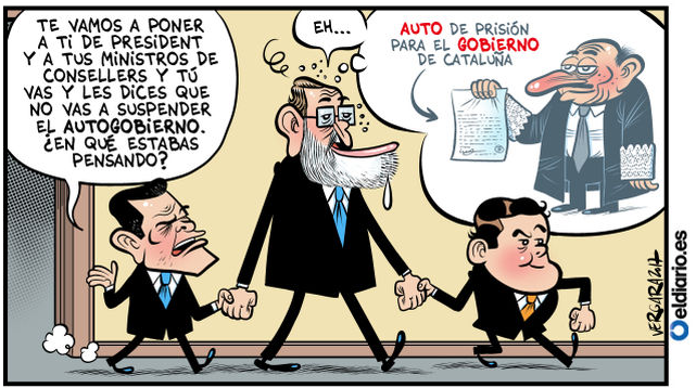 A gauche Pedro Sánchez (PSOE), à la traîne mais donnant la main à Rajoy : Nous allons te mettre toi President (de la Catalogne) et tes ministres "consellers" (ministres de l'Autonomie catalane) et, toi, tu vas et tu leur dis que tu ne vas pas suspendre l'AUTOGOUVERNEMENT. Non mais à quoi tu pensais ?