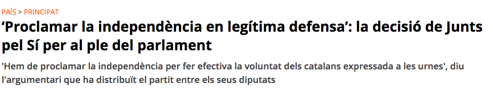 Junts pel Sí a clarifié la position que le parti doit prendre en séance plénière jeudi au Parlement de Catalogne : « Nous devons proclamer l’indépendance comme une voie défensive afin que l’Etat ne nous écrase pas. Faisons-le en légitime défense. » C’est le document auquel VilaWeb [cliquer] a eu accès, que la coalition distribue parmi ses membres avec un résumé des arguments et des indications pour les pourparlers qui ont lieu aujourd’hui et demain dans toute la Communauté.
