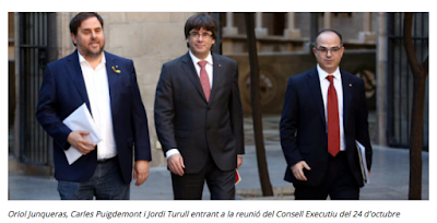 Ce matin les médias espagnols se faisaient l'écho des pressions dans l'entourage de Carles Puigdemont pour qu'il ne proclame pas l'indépendance. Ils tentaient d'évaluer, sans bien y parvenir, le rapport de force entre les intransigeants, telle la 'Consellera' ["ministre" du Govern] de l'Enseignement, qui proposerait de supprimer les droits d'inscription aux universités et les péages d'autoroute, pour ... favoriser les mobilisations de rue, et les "souples", parmi lesquels le très influent 'Conseller' des Entreprises et de la Connaissance, Santi Vila, qui aurait mis sur la table sa démission, ce qu'il a aussitôt nié. Les mêmes pressions contre la DUI [Déclaration Unilatérale d'Indépendance] monteraient dans le PDeCAT, le parti du President. Lire ici