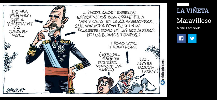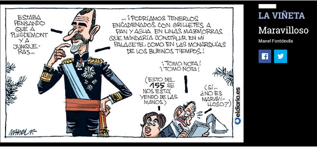 Le Roi : J'étais en train de penser que Puigdemont et Junqueras...On pourrait leur mettre les fers aux pieds, les foutre au pain sec et à l'eau, aux oubliettes que je ferais construire dans mon hôtel personnel, comme sous les monarchies du bon vieux temps !