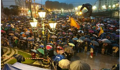 35 000 personnes environ, selon des sources municipales, ont participé, malgré une forte pluie, à la troisième manifestation, depuis un mois et demi, d'appui à la Catalogne. Cette fois le PNV (parti de centre droit nationaliste, majoritaire en Euskadi) avait boudé l'appel pour un désaccord sur la façon de conduire l'action. En revanche avaient répondu présents la gauche radicale basque EH Bildu, les syndicats nationalistes combatifs ELA (le plus représentatif avec 40% des délégué-es), LAB (19%), ESK (gauche syndicale), Steilas (Enseignant-es), parmi d'autres, la plateforme Gure Esku Dago (association basque pour le droit de décider, type ANC et Omnium catalanes) et les partis Podemos et Ezker Anitza-IU (IU basque, sorte de Front de Gauche).
