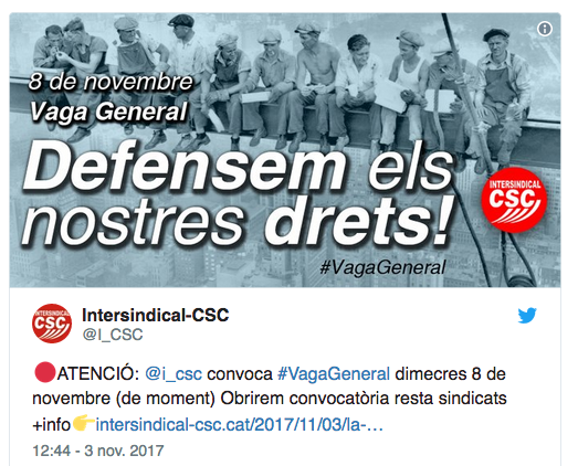 Rappel : le syndicat, minoritaire, Intersindical-CSC (5e force syndicale de Catalogne, elle se revendique indépendantiste et de classe) appelle à la grève générale pour le mercredi 8 novembre (avec possible reconduction le lendemain) pour protester contre la "régression des droits sociaux" et la précarité au travail en Catalogne. Sans mention explicite de la répression judiciaire qui s'abat sur la Généralité, histoire de contrecarrer l'action de la principale organisation patronale catalane Foment del Treball qui a saisi les tribunaux pour que soit déclarée illégale cette grève car elle obéirait à des motivations politiques et non syndicales.
