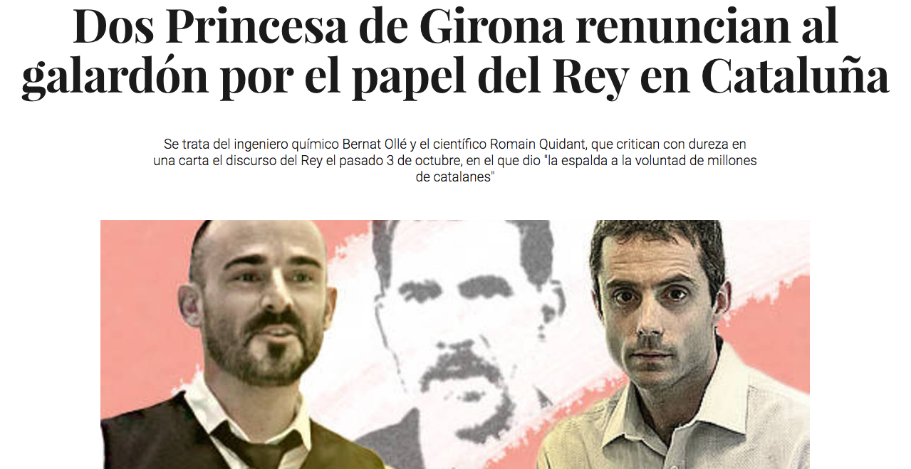 L'un est ingénieur chimiste, l'autre scientifique, ils avaient été distingués par le jury de la Fondation Princesse de Girona et avaient reçu pour le premier, en 2015, le prix dans la catégorie Entreprise, et le second, en 2011, dans la catégorie Recherche Scientifique. Ils ont décidé de restituer le montant du prix (10 000 euros). La raison ? Comme ils l'expliquent dans leur lettre à la fondation, "le travail que celle-ci a mené pendant des années pour bâtir des ponts a été liquidée par le récent positionnement de la Maison Royale et, en particulier, par le discours du roi Felipe VI le3 octobre dernier". Les récipiendaires de 2011 et 2015 considèrent que le roi a tourné "le dos à la volonté de millions de Catalans" et qu'il a évité de mentionner l'intervention policière qui a eu lieu le jour du référendum suspendu par le Tribunal Constitutionnel. Ils critiquent "une vague de répression menée par les institutions espagnoles contre la Catalogne" à travers l'emprisonnement de huit "ex consellers" du Govern de la Généralité et des présidents de l'ANC et de l"Òmnium Cultural".