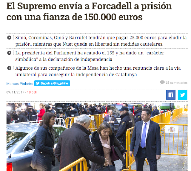 Carme Forcadell devra s'acquitter d'une caution de 150 000 euros pour sortir de prison dans l'attente de son procès. Quatre membres du Bureau du Parlament sont laissés libres contre le versement, dans un délai d'une semaine, d'une caution de 25 000 euros chacun, mais sont placés sous contrôle judiciaire. Un cinquième, qui avait voté contre l'indépendance a été laissé en liberté sans n'avoir à supporter aucune mesure restrictive.La présidente du parlement et trois des membres du Bureau ont insisté, pour leur défense, sur l'absence de valeur juridique de la déclaration d'indépendance faite par le parlement catalan le 27 octobre. Un quatrième membre du Bureau est allé plus loin en déclarant que le référendum du 1er octobre n'avait pas présenté toutes les garanties, qu'il rejetait la déclaration unilatérale d'indépendance et que la seule solution était d'obtenir un référendum négocié avec Madrid. Il a alors été suivi par deux de ceux quien étaient restés à la reconnaissance de non-validité juridique de la déclaration d'indépendance. Le dernier mis en examen a seulement rappelé qu'il n'avait en rien facilité le passage à l'acte d'indépendance.