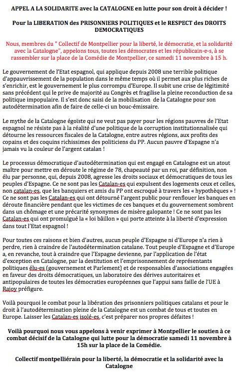 Montpellier le 11 novembre se mettra aux couleurs de la Catalogne qui lutte pour ses droits !