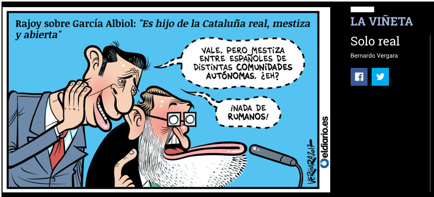 Rajoy au sujet de García Albiol (le chef du PP de Catalogne) : "Il est le fils de la vraie Catalogne, métisse et ouverte". Sous-entendu pas de la Catalogne égoïste et raciste des indépendantistes....