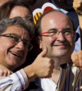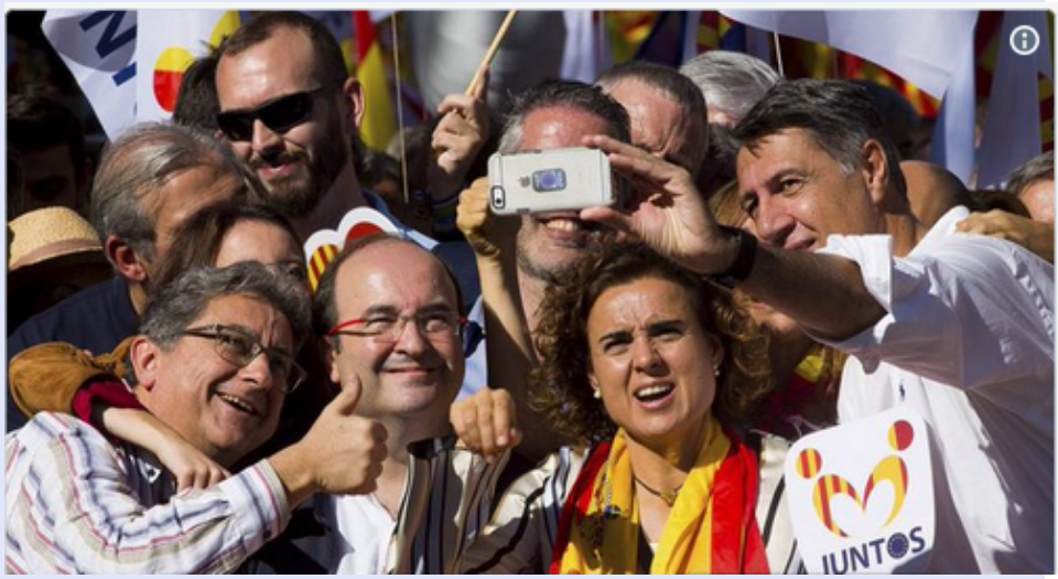 Le deuxième en partant de la gauche est Miquel Iceta, le secrétaire général des socialistes catalan-es, à ses côtés, outre la ministre de la santé de Rajoy, García Albiol est en train de prendre, en pleine connivence avec lui, un selfie qui a particulièrement été commenté sur les réseaux sociaux ! Cela se passait à la grande manifestation de Barcelone du 29 octobre pour la défense de l'unité de l'Espagne et pour le 155 à infliger à la Catalogne ! Lire ici