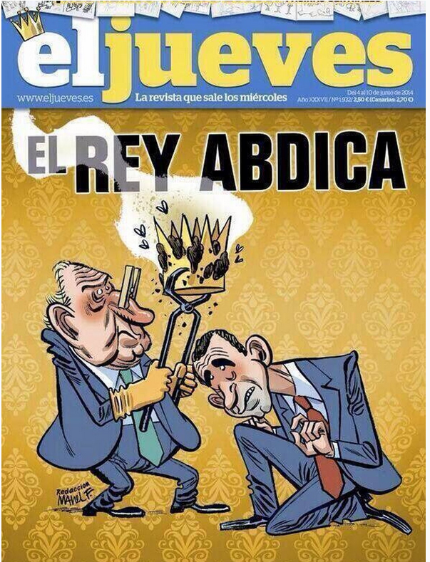 Lors de l'abdication en 2014 de Juan Carlos et du passage de couronne à son fils, il y avait eu ça qui se passe de commentaire (sinon qu'il est fait allusion à la corruption de l'abdiquant). La direction avait décidé d'elle-même de retirer le numéro, au grand mécontentement de nombre de ses collaborateurs... Lire ici