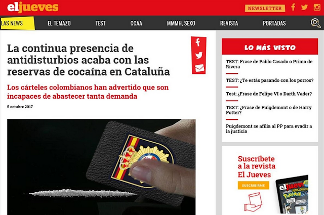 L'autre plainte policière vise la revue satirique El Jueves (Le Jeudi) pour une plaisanterie faite, le 5 octobre, sur son site par laquelle il était affirmé que, pour cause de présence de la police à Barcelone, les stocks de cocaïne de la Catalogne étaient épuisés. Il était indiqué que les cartels colombiens de la drogue se disaient capables de répondre à une telle demande ! Pour apprécier l'humour il faut dire que ladite plaisanterie reposait sur de supposées déclarations d'agents anti-émeutes ayant opéré plusieurs charges contre des personnes désireuses de voter au référendum du 1er octobre. L'un des agents se défendait par ces mots "Je vous en prie, nous voulions seulement obtenir quelques grammes pour tuer le temps agréablement. Mais ça ne s'arrange pas, et il va nous falloir vite remettre ça".
