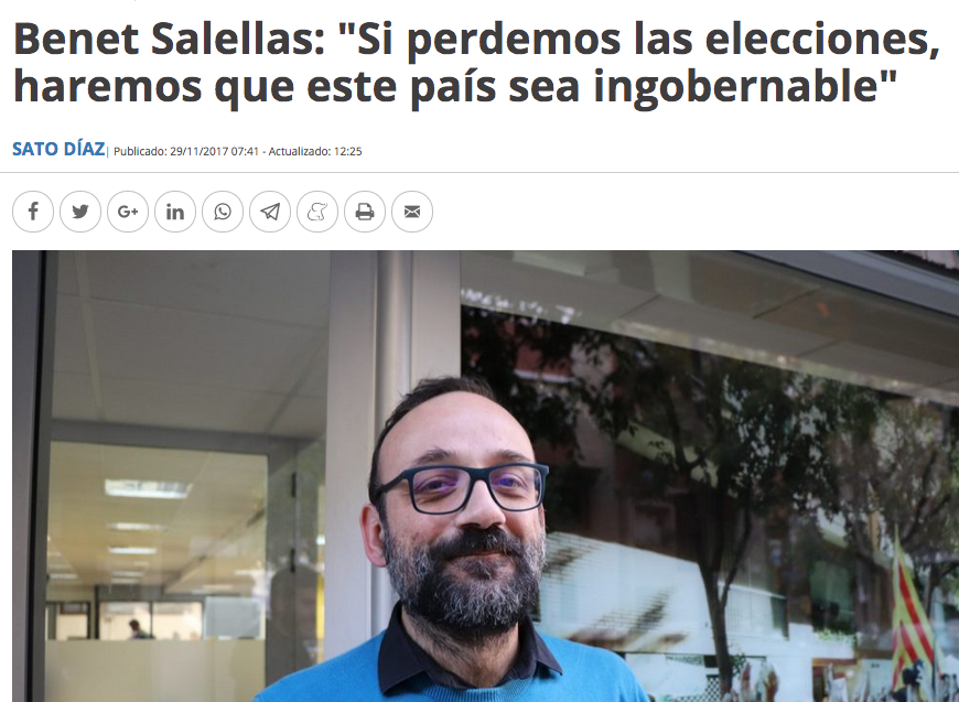 Benet Salellas : Le mouvement indépendantiste catalan s'est très clairement engagé en faveur de la non-violence et de la lutte pacifique et civile. Nous accuser de vouloir user de la violence, ne cherche qu'à faire dérailler le débat que l'indépendantisme doit se coltiner, le débat sur le pouvoir. La fracture qu'il y a entre la proclamation de la république et la concrétisation de cette proclamation, voilà ce qui doit nous faire réfléchir. Comment allons-nous obtenir que la république devienne réalité ? Si nous n'avons pas d'armée, et nous ne voulons pas en avoir, car notre position non-violente est aussi antimilitariste... Si nous n'avons pas un corps de police réellement engagé à défendre les mandats du Parlament, eh bien, nous devrons réfléchir à la façon de nous défendre de la violence de l'Etat, dont on sait qu'elle s'exercera, elle s'est déjà exercée. En face, ils l'ont clairement montré, ils maintiendront, par-dessus tout, l'unité de l'Espagne.