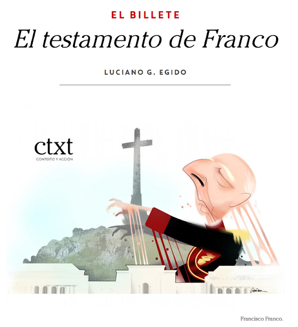 Note préliminaire du site NPA 34. La croix assise sur un rocher qui sert de fond à ce dessin est celle qui domine El Valle de los Caídos (La Vallée de ceux qui sont tombés, autrement dits les franquistes tombés au combat pendant la Guerre Civile), cette zone mausolée, à quelque 50 kilomètres au nord de Madrid abritant toujours, Loi de la Mémoire Historique ou pas, les tombes de Franco et de José Antonio Primo de Rivera, le fondateur de la Falange, le parti fasciste espagnol. Quant à la Constitution de 1978, elle s'accommode mieux que bien de cet état de fait mais pas de ce que décident les Catalan-es...