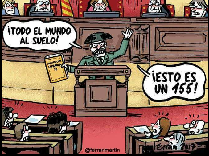 Note : allusion humoristique à la tentative de coup d'Etat emmené par le lieutenant-colonel de la Garde Civile, Antonio Tejero. C'était le 23 février 1981 (voir ici). A la tête de 200 Gardes Civils, il s'était emparé du Congrès des députés réuni en séance plénière pour procéder au remplacement de Adolfo Suárez comme Président du gouvernement.La phrase qu'ils prononça "Todos al suelo" ("tout le monde au sol"), adressée aux député-es, restera célèbre. L'armée n'ayant pas répondu à l'appel du putschiste, ce que le roi avait entériné dans une allocution télévisée, le fiasco a scellé l'aventure. Les mutins se sont rendus. Les zones obscures, en particulier sur le rôle exact du roi dans cette opération, sont "secret défense". Ce dessin fait le lien avec ce que d'aucuns voient de "franquiste" dans l'utilisation de l'article 155 de la Constitution contre la mobilisation des Catalan-es.