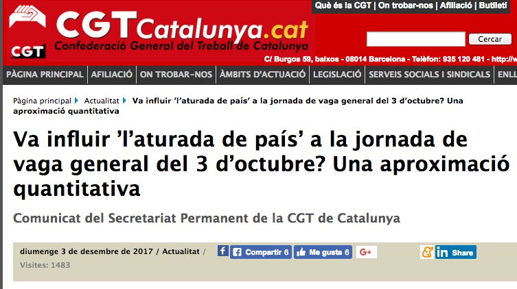 Affinités révolutionnaires obligent, un grand merci à nos camarades anarcho-syndicalistes de la CGT de Catalogne, qui n'en démordent pas. C'est bien une grève générale ouvrière qui a eu lieu le 3 octobre dernier en Catalogne, à son appel avec quatre autres organisations syndicales de lutte de classe, qu'elles se revendiquent de l'indépendantisme ou pas. Se fondant sur les données statistiques de l’IDESCAT (l’INSEE catalane) comptabilisant les heures de grève du mois d'octobre 2017, qui sont tombées début décembre, la CGT de Catalogne, dans un communiqué daté du 3 décembre, fait la démonstration limpide que, nonobstant l'appel à l'« arrêt du pays » initié par les syndicats de collaboration de classe, les CCOO et l'UGT, et relayé par le gouvernement catalan et l'ANC et Òmnium, pour faire contre-feu à la grève générale, le 3-Octobre en Catalogne a été le plus puissant mouvement gréviste de travailleurs de ces 25 dernières années dans tout l'Etat espagnol… De quoi faire réfléchir, espérons-nous, tous les sceptiques de la gauche radicale et de l'extrême-gauche en Europe qui ne veulent pas voir que mobilisation sociale ouvrière et mobilisation indépendantiste marchent à l'amble.