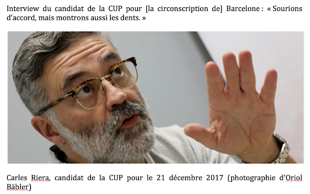 Nous vivons les derniers jours de la campagne électorale et nous entrons dans la semaine des élections imposées par le gouvernement espagnol depuis son coup d’État. La répression a été forte, et le mouvement républicain se doit de se préparer rapidement à la résistance pacifique et à la désobéissance civile. Qui de mieux pour parler de tout cela qu’un disciple de Lluís Maria Xirinacs (1), membre fondateur de la Crida a la Solidaritat [« l’Appel à la Solidarité pour la défense de la langue, la culture et la nation catalanes », dit la Crida, l'Appel, où Carles Riera a milité avec Jordi Sànchez durant la décennie 80. NdT] et actuellement numéro 1 de la liste électorale de la CUP sur la circonscription de Barcelone ? Le candidat de la CUP souligne que la transition « de la loi [espagnole] à la loi [catalane] » n’a pas pu se faire, comme certains l’avaient pronostiqué, qu’avec le sourire cela ne suffit pas, que le nouveau gouvernement devra négocier en parlant du point de départ et pas du point d’arrivée, que plusieurs structures de l’État catalan n’ont pas été préparées avec réalisme, que la position des Comuns relève plus du cynisme que de l’ignorance, et qu’il faudra faire des pas en avant et des pas en arrière dans cette nouvelle phase vers la consolidation de la République. Cliquer ici