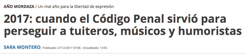 L’une des premières polémiques de l’année est venue de la sentence qui condamnait la twitteuse Cassandra à un an de prison pour ses plaisanteries sur le président du Gouvernement franquiste Luis Carrero Blanco (1). Le tribunal avait estimé que les 13 tweets incriminés de cette jeune femme étaient un acte d’humiliation envers les victimes du terrorisme. La sentence prononcée sortait le personnage public de tout contexte en oubliant qu’il avait été un dirigeant de la dictature et en le mettant au même niveau que d’autres victimes du terrorisme. […]