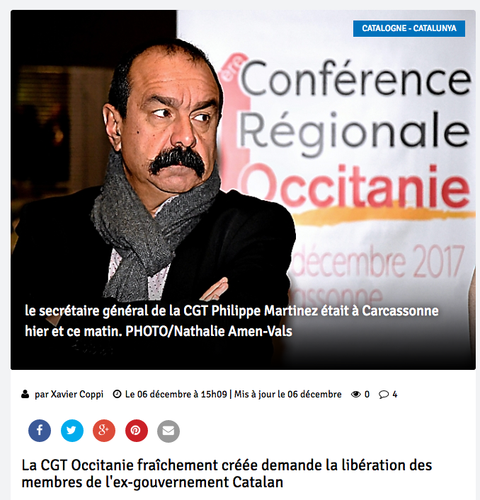 230 Cgtistes, leur nouveau bureau et le secrétaire général de la CGT Philippe Martinez condamnent la "répression policière" : "En envoyant la police réprimer l'organisation du référendum et en emprisonnant ses opposants politiques, le gouvernement Rajoy a délibérément fourni des arguments à ceux qui voulaient une déclaration unilatérale d'indépendance. Avec nos camarades des syndicats de Catalogne, nous exigeons l'arrêt immédiat des détentions et actions policières au sein des institutions catalanes. " Cliquer ici