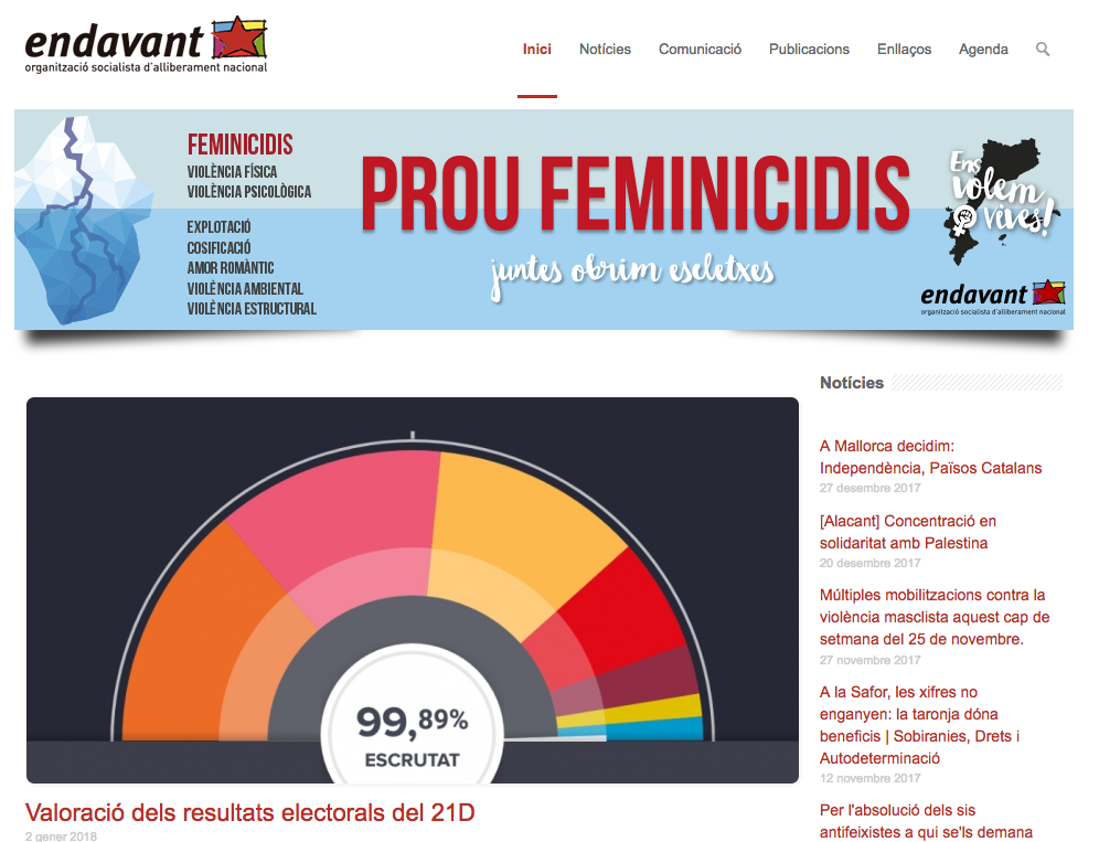 En ce qui concerne les résultats électoraux, Endavant soutient que l'indépendantisme doit faire une proposition politique claire et concrète sur les services publics, les retraites, le logement, les salaires et les conditions de travail pour briser les « digues d'isolement» que l'espagnolisme a dressé contre le projet républicain. Il dit ceci en référence à la victoire de Ciutadanos et à sa capacité à capter le vote des classes populaires en brandissant l'argument identitaire.]