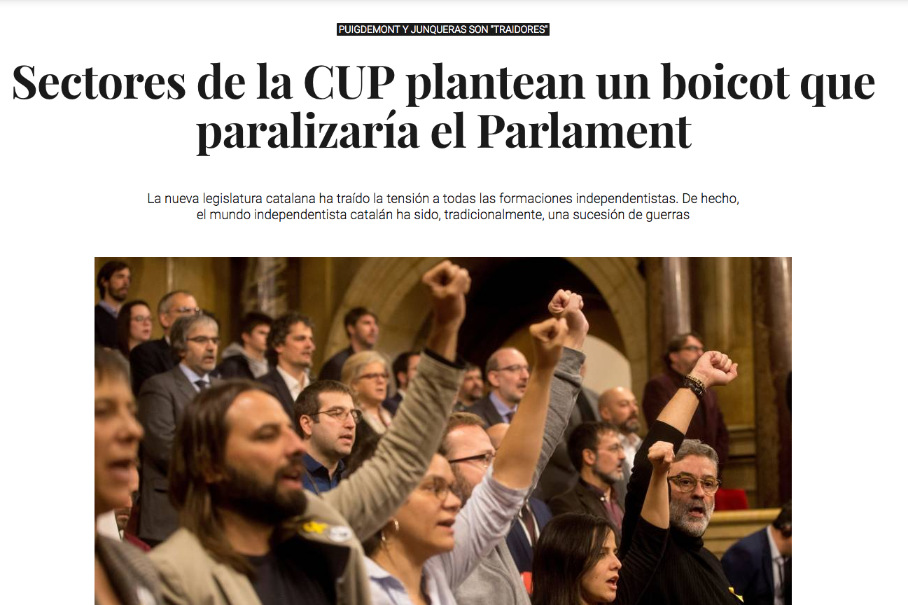 Nous nous sommes appuyés librement sur l’article en espagnol Sectores de la CUP plantean un boicot que paralizaría el Parlamen (El Confidencial, 20 01 2018)