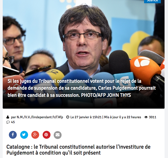 Demain mardi 30, le parlement de Catalogne se réunit pour élire le Président du Gouvernement catalan (Generalitat de Catalunya) sous la surveillance et les pressions diverses du gouvernement et la justice espagnols de Madrid (lire ci-dessous).