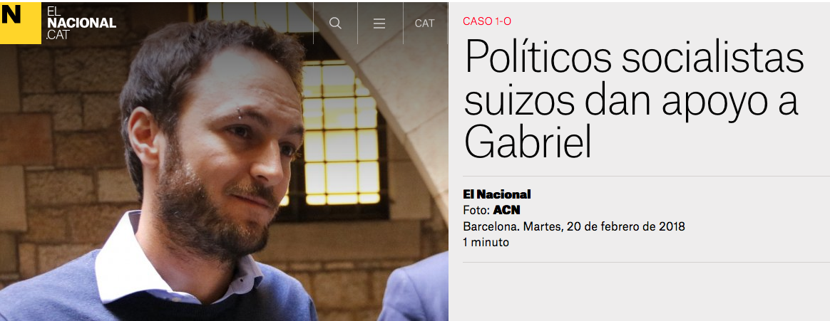 Le vice-président de l'Intergroupe sur la Catalogne au Parlement de la Suisse, le socialiste Mathias Reynard, a exprimé tout son "appui" à l'ex députée de la CUP Anna Gabriel qui se trouve à Genève. Dans un tweet, Reynard a déclaré que "la Suisse des Droits de l'Homme et de la démocratie directe" doit être "un lieu sûr" pour Gabriel.
