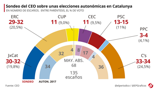 C'est à la CUP que revient le bénéfice principal de cette spectaculaire remontée puisqu'elle est créditée d'obtenir, si des élections avaient lieu maintenant, 11 député-es (9% des voix), son record, au lieu des 4 actuel-les. Résultat qui compense largement la baisse que subiraient les deux grandes formations indépendantistes : Junts per Cat, emmené par Carles Puigdemont, ne décrocherait plus que 30 à 32 député-es (19,8%), au lieu des 34 actuel-les, tandis que les républicains de gauche de l'ERC stagneraient à 32 ou reculeraient jusqu'à 29 (20,5%). L'ensemble indépendantiste consoliderait sa majorité parlementaire absolue en passant des 70 sièges actuels à 75.