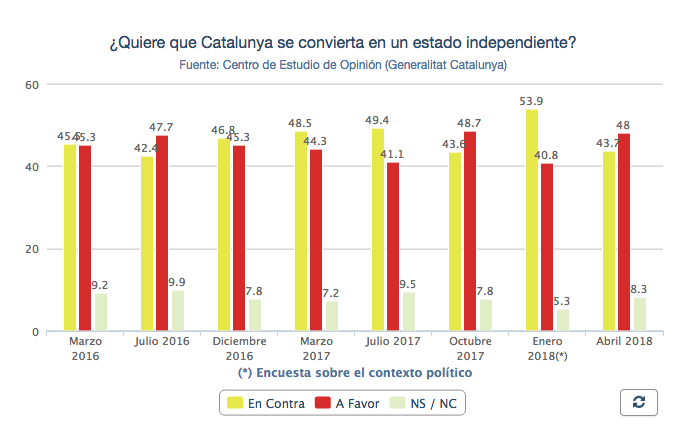 Le sondage que vient de publier le Centre d'Estudis d'Opinió (CEO), juste avant que l'on n'apprenne la candidature de Quim Torra à l'investiture de la Présidence de la Généralité, fait état d'une remontée des intentions de vote en faveur des partis indépendantistes alors que le précédent sondage du CEO, réalisé entre octobre et décembre derniers, manifestait la tendance très nettement inverse : on passe ainsi d'un score, en faveur de l'indépendance, de 40,8% à 48%, contre un mouvement contre l'indépendance de 53,9% à 43,7%. L'indépendantisme retrouve ainsi les intentions de vote qu'il fixait au plus fort de la mobilisation pour le référendum d'autodétermination en octobre de l'an passé.