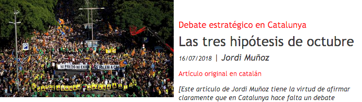 Devant cette situation biaisée, je crois qu'un débat public sur la stratégie est la condition permettant de retrouver du rapport de force et de se préparer en vue d'un nouveau et plus intense octobre, capable d'obliger l'Etat à négocier ou de rendre effective la république en ayant travaillé, dans les deux cas, à obtenir la solidarité active des peuples de l'Etat espagnol et de l'Europe. Voilà la position que j'ai exprimée en guise de contribution à ce débat. Et j'espère que l'article de Jordi Muñoz en suscitera bien d'autres.