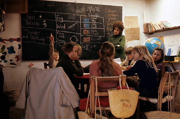 Entourés de jeunes enfants nés à l'étranger ou durant leur séjour à Ibiza, les immigrés de l'utopie sont tout naturellement confrontés à des problèmes de garde et d'éducation. Leur façon de vivre et leur commune critique du système éducatif traditionnel les portent vers une pédagogie alternative. Un souhait auquel ne peuvent satisfaire les écoles de l'île, publiques ou privées. Sans oublier, en cette époque franquiste, l'imposition du castillan à des écoliers qui l'ignorent majoritairement puisqu'élevés dans la langue catalane. D'où l'idée d'écoles internationales. Ainsi, se créeront des structures d'accueil selon l'âge et la langue. Can Arnau School, voit le jour en 1971, parce que John, jeune éducateur a des idées de pédagogie plein la tête et que Mary, mère de famille, ne parvient pas à résoudre les problèmes de scolarité de ses propres enfants. Dans une ancienne bergerie réaménagée, John fonde un établissement inspiré de l'exemple de Summerhill. Blat, créée en 1970 par deux universitaires valenciens, rassemble des enfants hispanophones dont les parents, artistes et intellectuels dans leur majorité, refusent le carcan moral des écoles d'Ibiza. Un an plus tard est créé l'Ecole internationale qui accueille une soixantaine d'élèves anglais, américains, canadiens, hollandais et allemands. Son ambition : préparer les enfants à vivre dans un monde où n'existeront plus les barrière nationales. Point sensible des visées utopiques, l'éducation alternative témoigne chez les jeunes adultes immigrés d'Ibiza d'une immense confiance en l'avenir et en leur capacité à changer la vie...