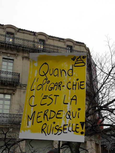 Des slogans fleurissent : "quand l'oligar-chie, c'est la merde qui ruisselle",