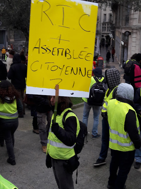 De nombreux gilets jaunes font signer la pétition appelant au RIC (Référendum d'Initiative Citoyenne) et les discussions s'engagent : manifestement pour beaucoup d'entre eux, la revendication de créer le RIC est l'expression d'une aspiration démocratique, première étape d'une transformation en profondeur du système politique, tout en étant conscients qu'il faut maintenir la pression et conserver l'ensemble des revendications sans les hiérarchiser. Certains sont convaincus que c'est le moyen de passer la difficile période des fêtes, avec un objectif qui peut apparaître concret, pour mieux rebondir en janvier. Le risque est, au contraire, d'enterrer le mouvement, et de conforter le gouvernement dans son espoir de voir les choses se calmer.