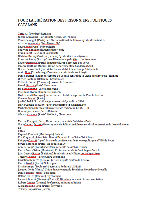 Des droits fondamentaux sont ouvertement bafoués : droit d’autodétermination, droit de se réunir, de manifester et de s’organiser pour l’exercer. Cette politique répressive anti-démocratique se base en partie sur la manipulation de la loi antiterroriste dite loi Mordaza. Déjà condamnés ou mis en examen, des rappers, des humoristes, pour avoir critiqué les agissements de la royauté. Aucun dialogue démocratique digne de ce nom ne saurait être entamé sans que ne soient libérés toutes celles et tous ceux qui sont poursuivis pour avoir exercé leurs droits civiques.