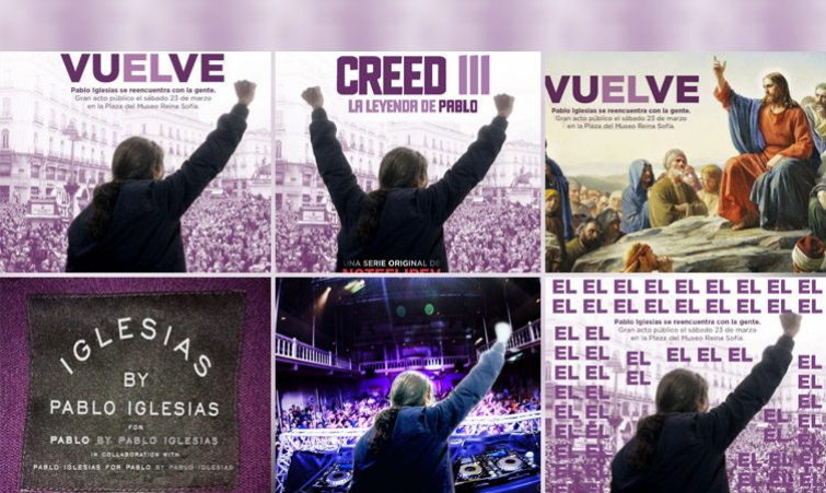 Le détournement sur les réseaux de l'affiche de Podemos : au lieu du "Vuelve", "Creed" (Croyez); Iglesias en Jésus s'adressant à la foule; Iglesias, autrement dit "Eglises", par Pablo Iglesias; Iglesias en concert et, enfin le "él" (lui) s'est extirpé de "VuELve" en une duplication à l'infini sur le mode revisitons, régression hyperbolique assurée, le célèbre culte de la personnalité cher au "petit père des peuples".