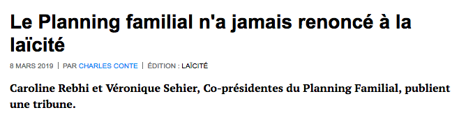 […] Parce que le sexisme ne sera pas vaincu sans combats simultanés contre l’exploitation capitaliste, contre le racisme, contre les obscurantismes en tous genres, le Planning poursuivra ce travail et cette lutte pour l’autonomie de toutes et tous et pour défendre la laïcité : il n’y a pas d’alternative au vivre ensemble ! Cliquer ici