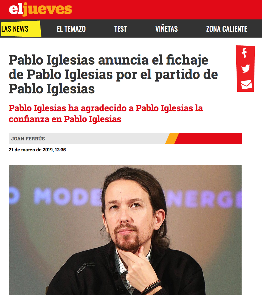 Suivant la mode des partis qui font signer des stars en vue des prochaines élections, Pablo Iglesias a annoncé que la liste de Pablo Iglesias aura pour tête de liste Pablo Iglesias.