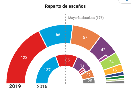 Vox : 24 député-es (rien avant) pour un peu plus de 10%. Il ne confirme pas que sa percée andalouse de décembre dernier était le prélude à une recomposition à droite permettant d'accéder au gouvernement central. Cela dit, ses 10% installent durablement ce parti dans le paysage politique espagnol dans un cadre parlementaire et gouvernemental loin d'être stabilisé car ces élections confirment que le bipartisme, qui avait régi la démocratie outre-Pyrénées depuis la fin du franquisme, est bien mort. L'obligation qu'a tout parti majoritaire de se chercher des alliés pour gouverner devient vite un casse-tête insoluble au vu de l'ampleur des problèmes à régler : en premier lieu celui d'une revendication indépendantiste catalane qui, d'une part, sort renforcée de cette consultation mais qui, d'autre part, est devenue un point de focalisation espagnoliste lui-même générateur de terribles contradictions et fragilisations chez les anticatalanistes/anti-indépendantistes/non-indépendantistes (PP, Ciudadanos, Vox mais aussi PSOE mais encore Podemos, Communs).