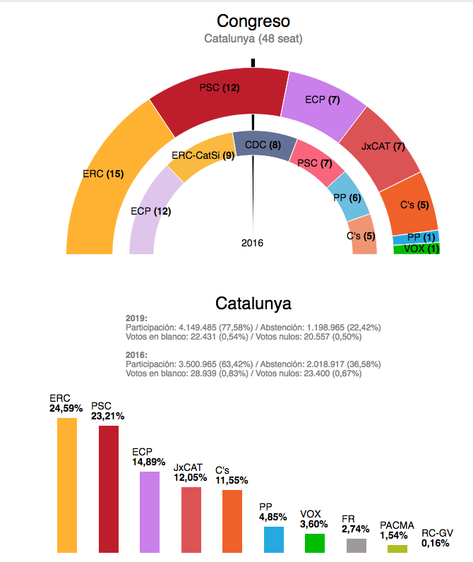 Précision : pour ceux et celles qui s'échinent, allez savoir pourquoi, à inclure ECP dans le groupe des anti-indépendantistes, il faut rappeler que leur tête de liste, Jaume Assens, est parmi les plus proches, parmi les Communs, des indépendantistes. Ce qui a d'ailleurs provoqué des remous dans Podem au moment de la confection de la liste. Et cela même si ce rassemblement ne prend pas partie pour l'indépendance, en droite ligne avec la position dite "niniste", "ni DUI (Déclaration Unilatérale d'Indépendance) ni 155 (dissolution des institutions représentatives de l'Autonomie catalane)", "ni Puigdemont, ni Rajoy", position que ses composantes, tant les Communs que Podem, ont défendue pendant la séquence référendaire de septembre-octobre 2017. Au demeurant la principale dirigeante des Communs, Ada Colau, maire de Barcelone, a voté à ce référendum et pas précisément pour l'indépendance.